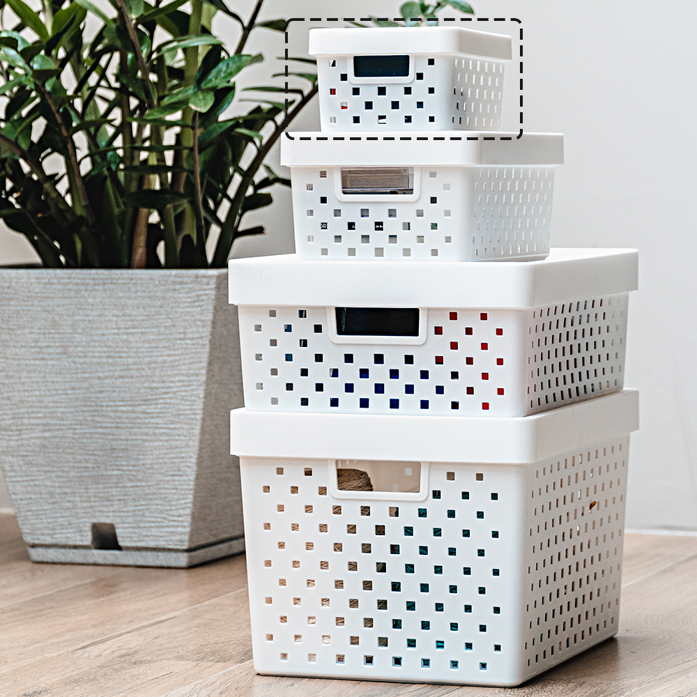 – 1 cesto organizador com tampa feito em plástico na cor branca.