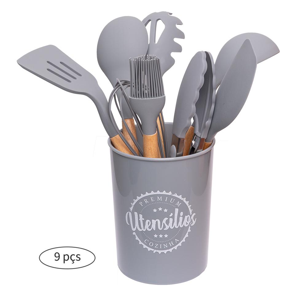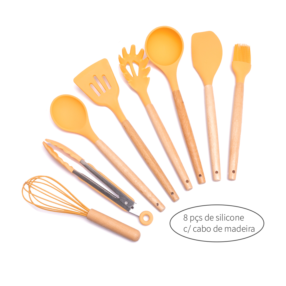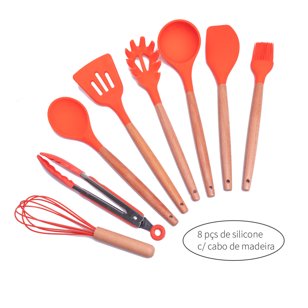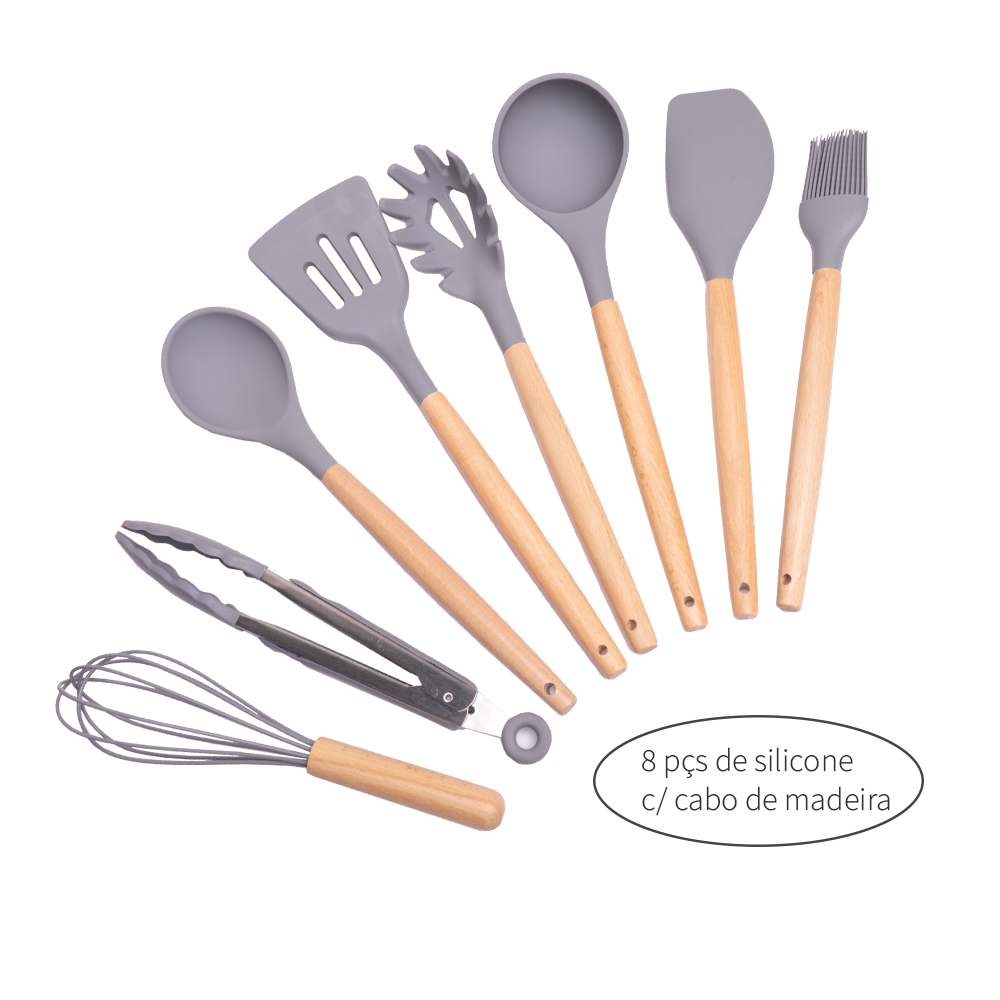 – Conjunto de utensílios revestido em silicone e cabo de madeira;