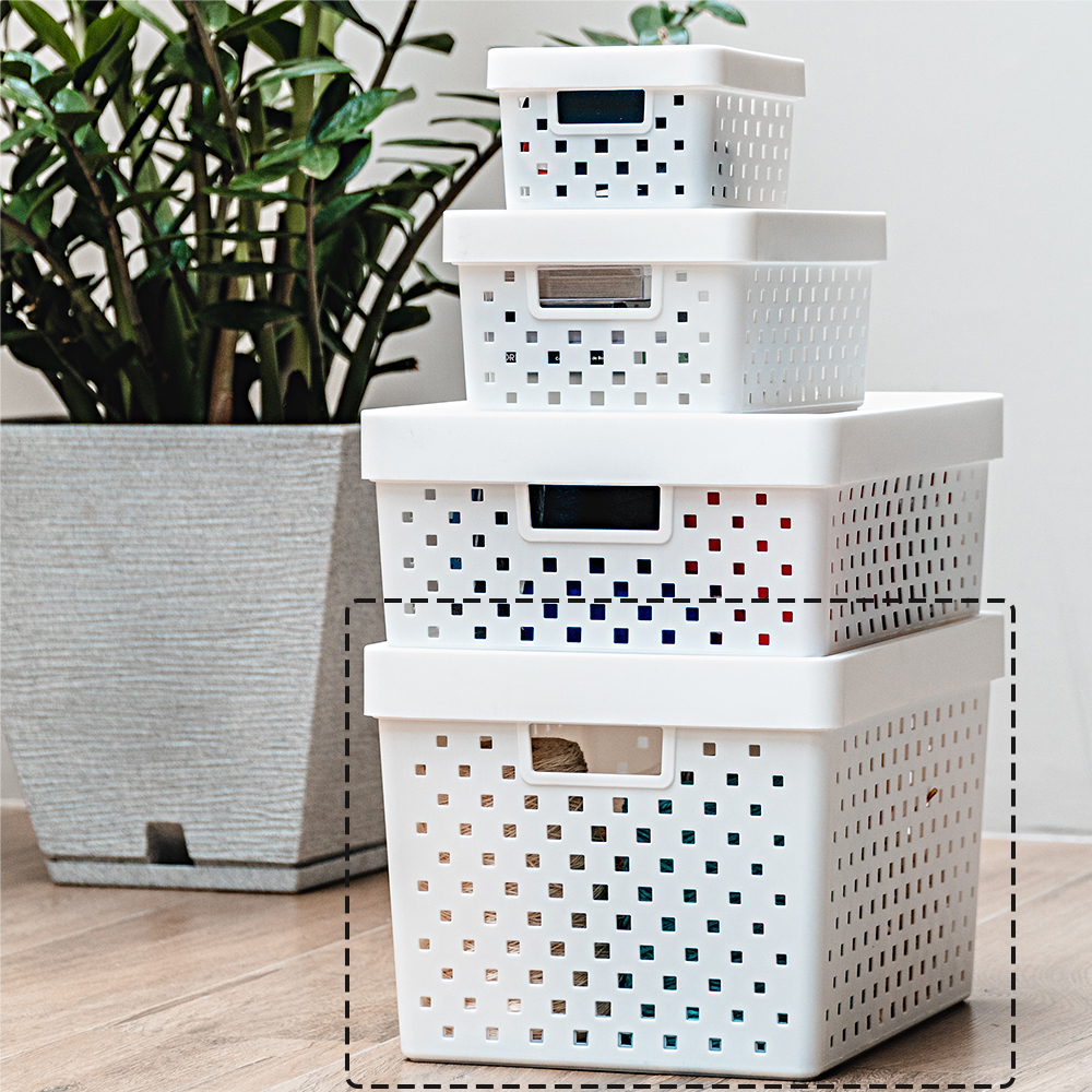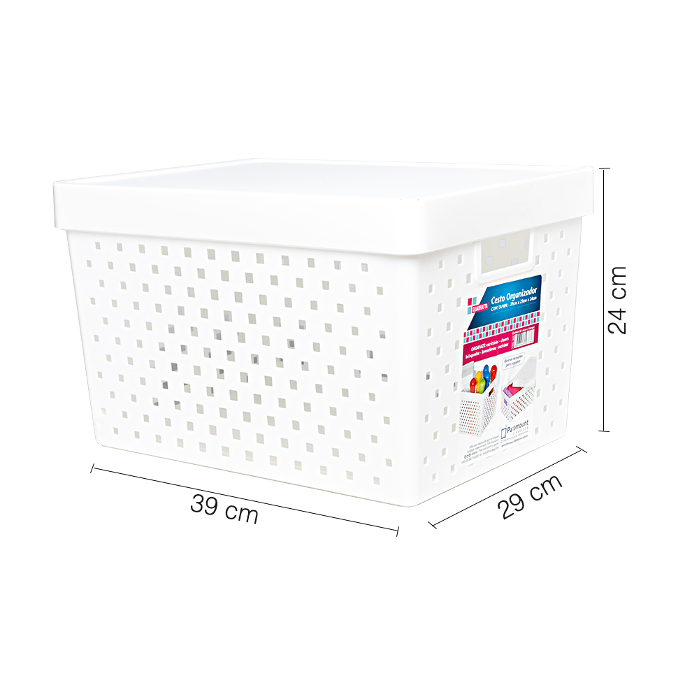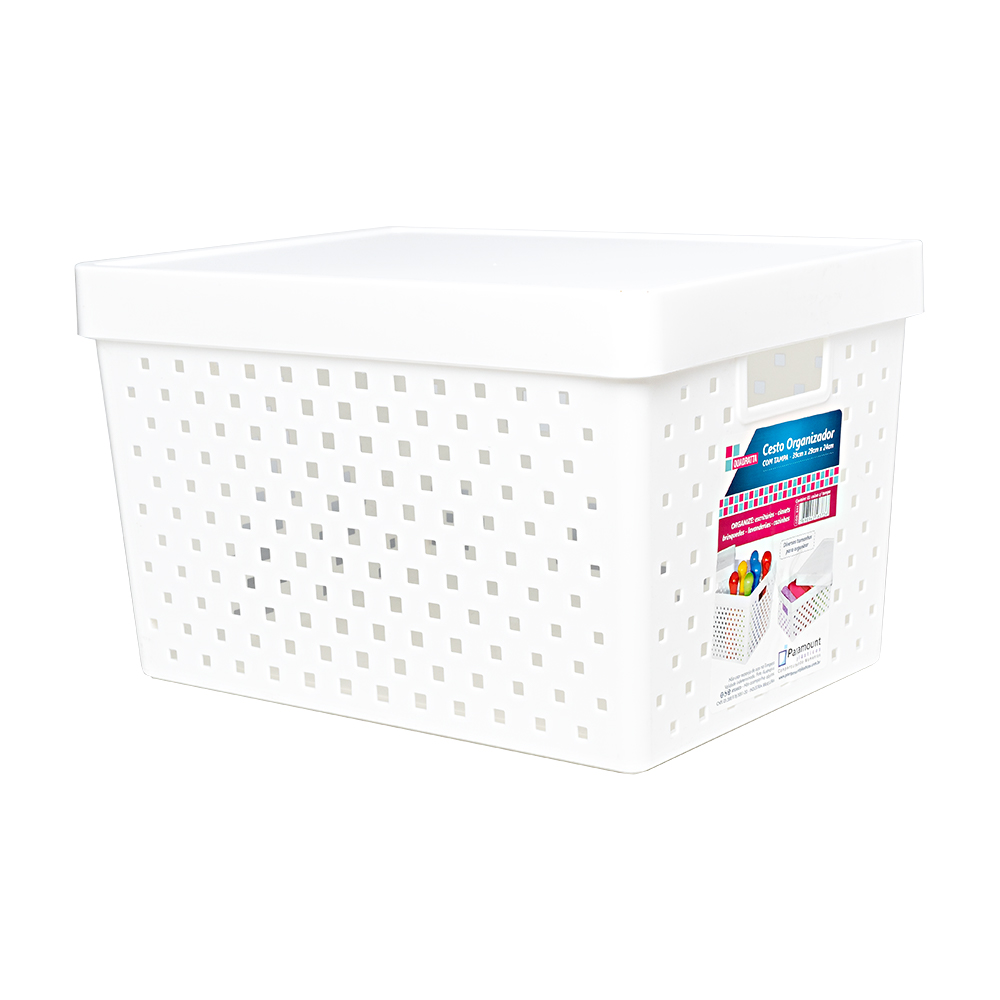 Produto novo, composto por plástico, moderno, prático e durável. Desenvolvido para proporcionar praticidade e organização do ambiente, o cesto possui um formato retangular e possui inúmeros furos de ventilação nas laterais para evitar o surgimentos de odores indesejados, uma tampa de fácil remoção e uma alça em cada lateral.