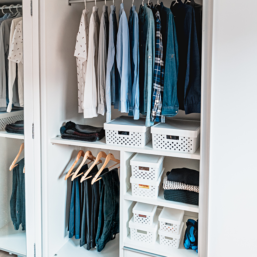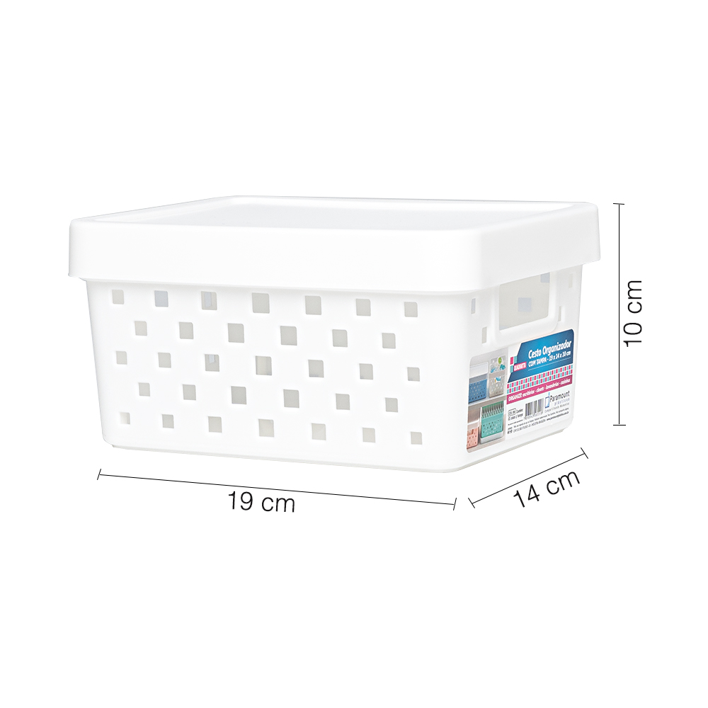 – 3 cesto organizador com tampa feito em plástico na cor branca.