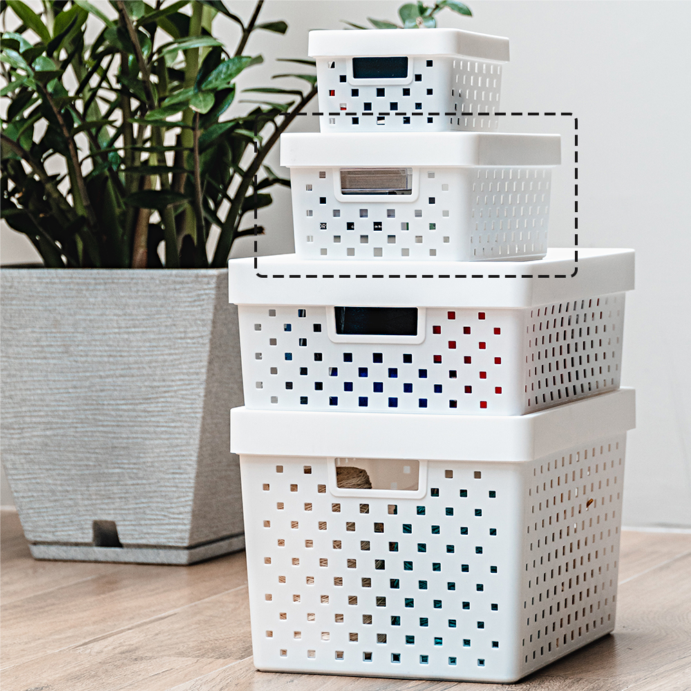 – 3 cestos organizadores com tampa feito em plástico na cor branca.
