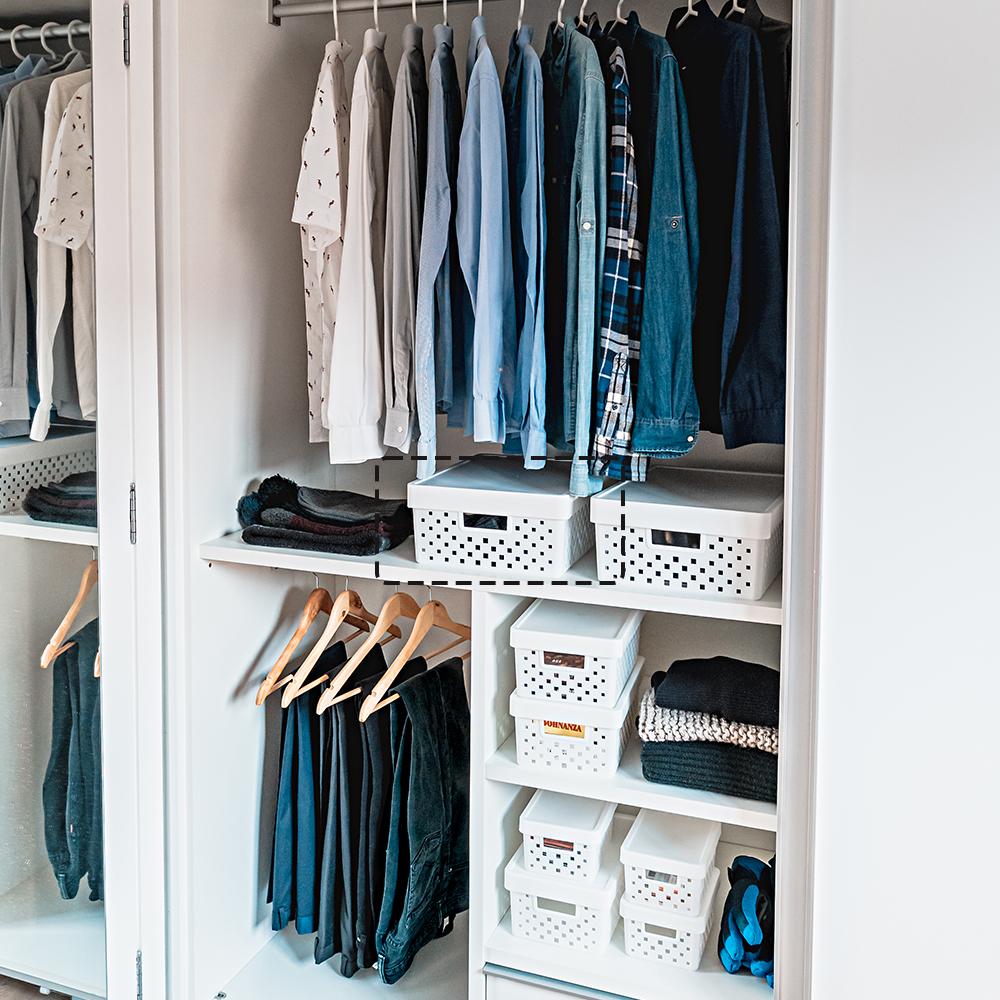 – 3 cestos organizadores com tampa feito em plástico na cor branca.