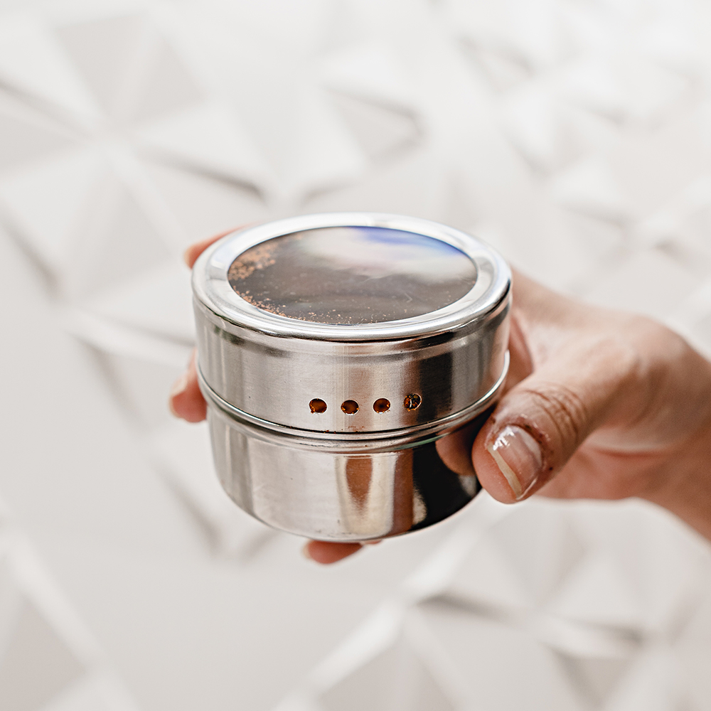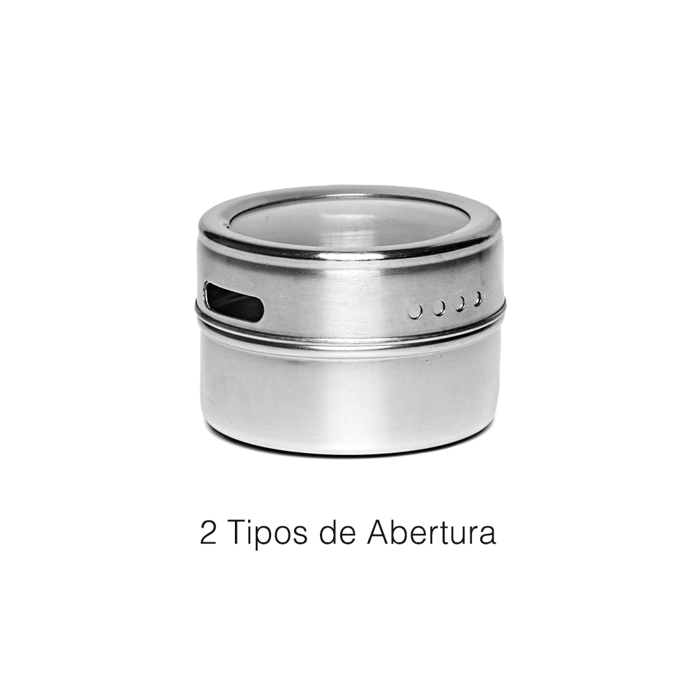 Feito em Aço Inox, não deixando cheiro e gosto caso queira mudar o tempero armazenado.