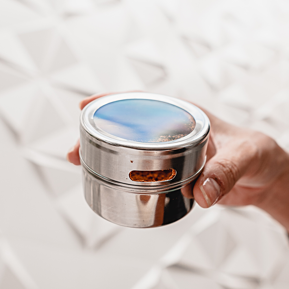 Na parte superior há um visor de vidro para fácil identificação do tempero.