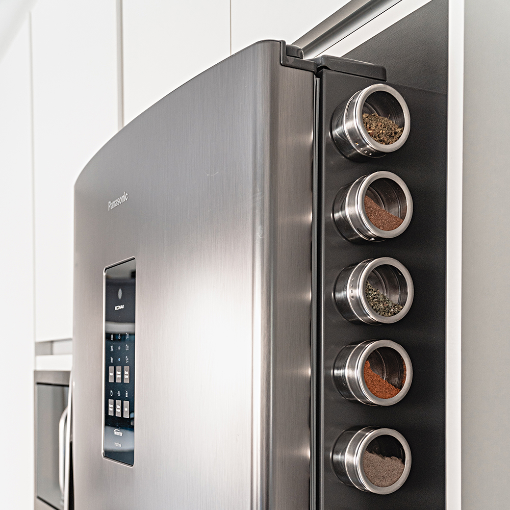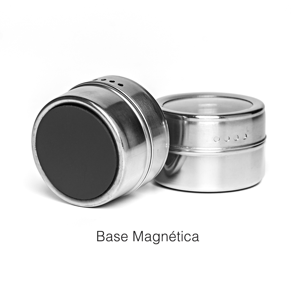 Conjunto de 6 potes para armazenar diferentes temperos e 1 suporte retangular em inox. Produto novo, moderno, prático e durável. A sua base possui um imã que facilita a fixação no suporte e permite o uso na parede da geladeira.